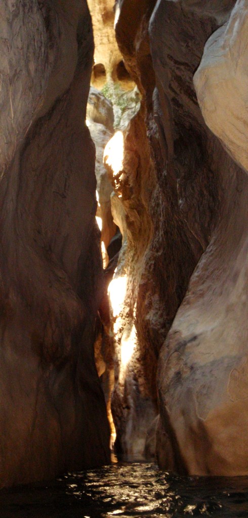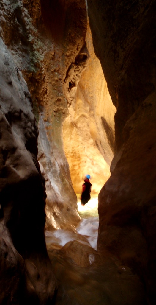 El túnel de toba es uno de los tramos más impresionantes de todos los barrancos que llegaba a conocer. La cal del agua que mana en una fuente en lo alto de un pequeño caos soldó las rocas entre ellas y convertí el mismo en una cueva por la cual pasa el río.