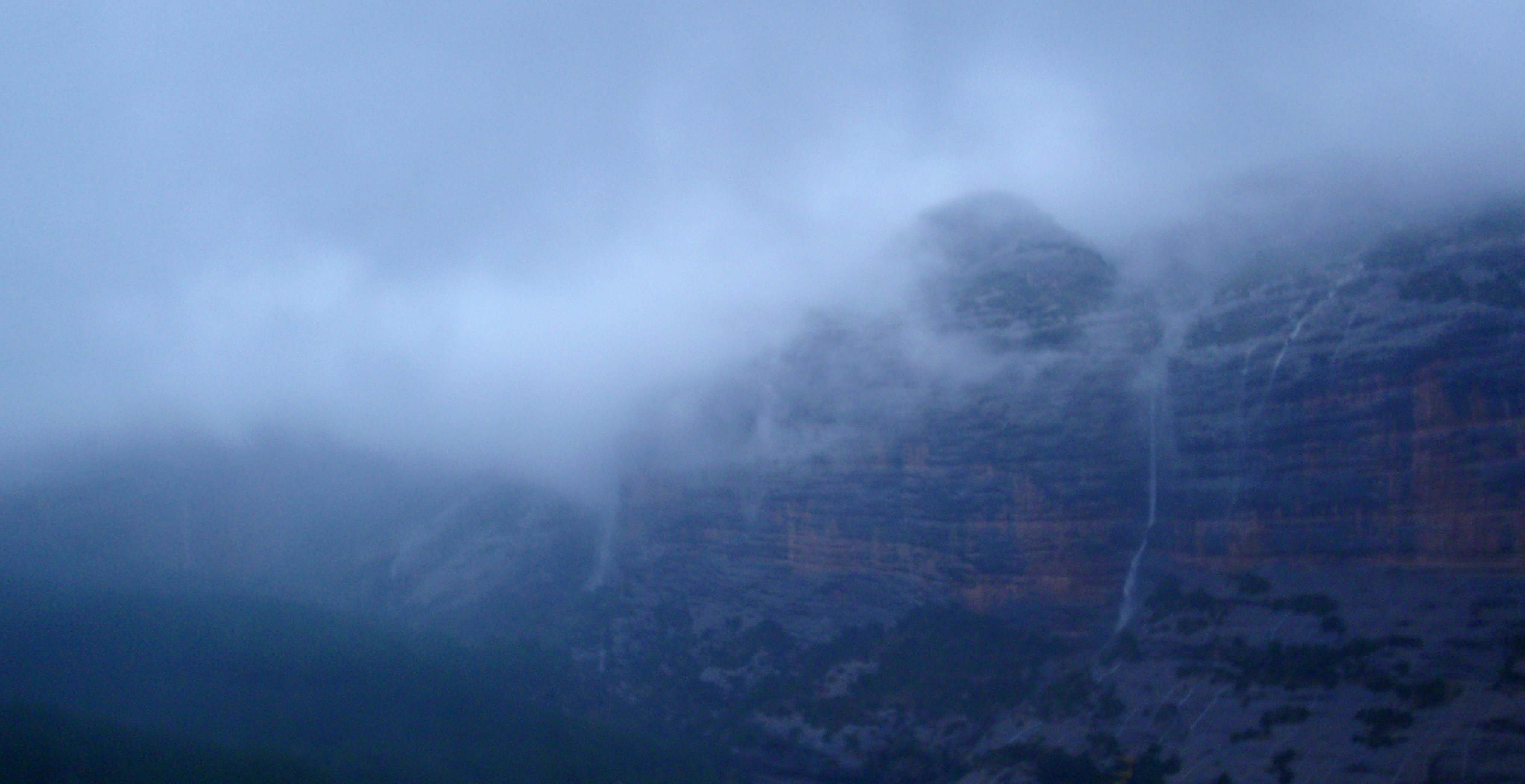A la derecha está el Barranco Lazas donde salta el agua con una fuerza brutal en el último resalte de la parte vertical. En medio se ve el Escomentué bajando de las nubes y al fondo, más a la izquierda, se adivina la cascada de 150m del Foratata.