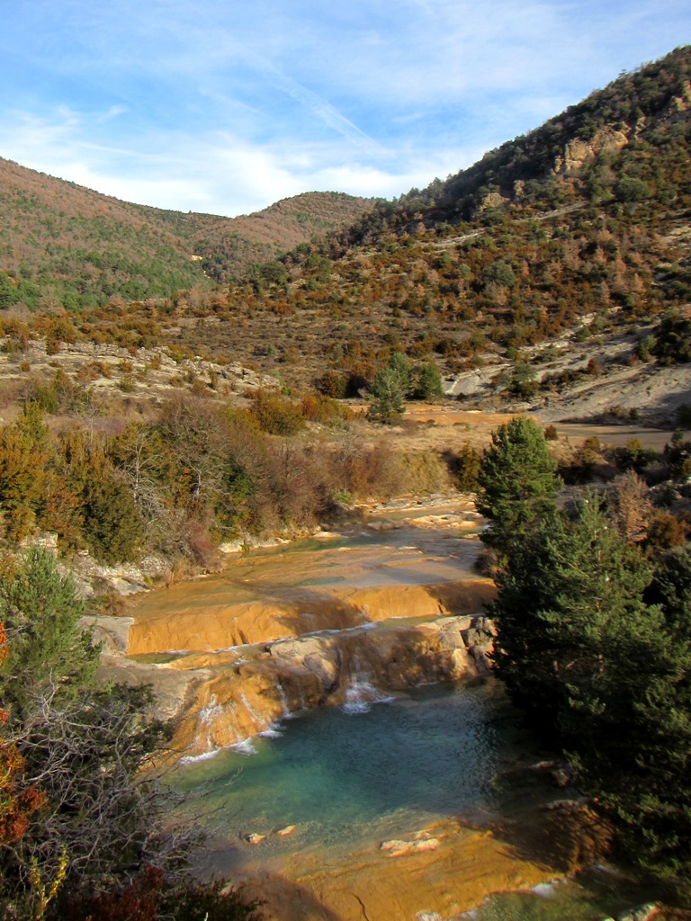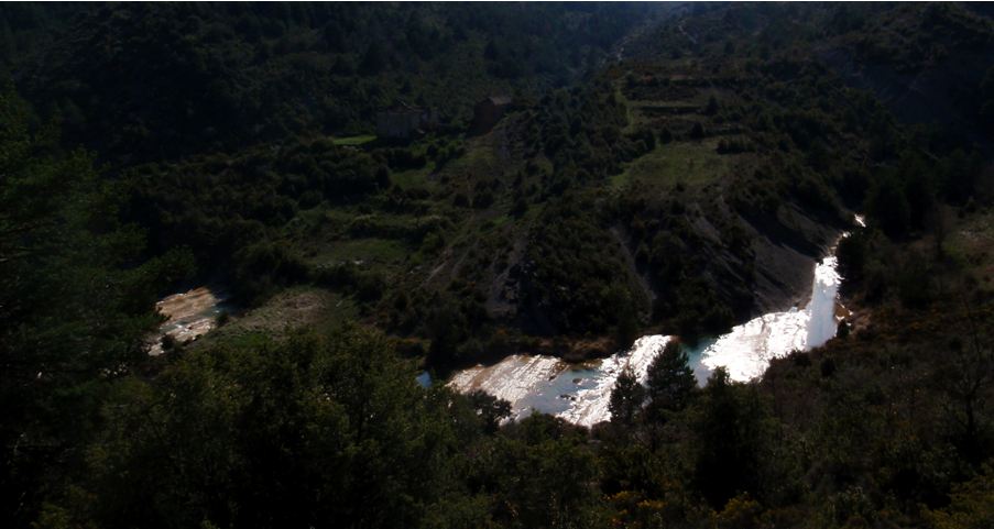 El Río Flumen Superior, cual es el nombre que figura en los mapas, forma este breve estrecho. Este ramal del Río Flumen suele llevar un hilo de caudal durante todo el año, pero es en la primavera cuando la ultima cascada se presenta en su forma más espectacular, sin duda.