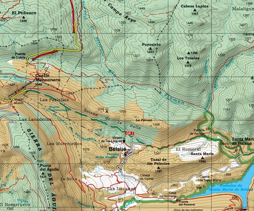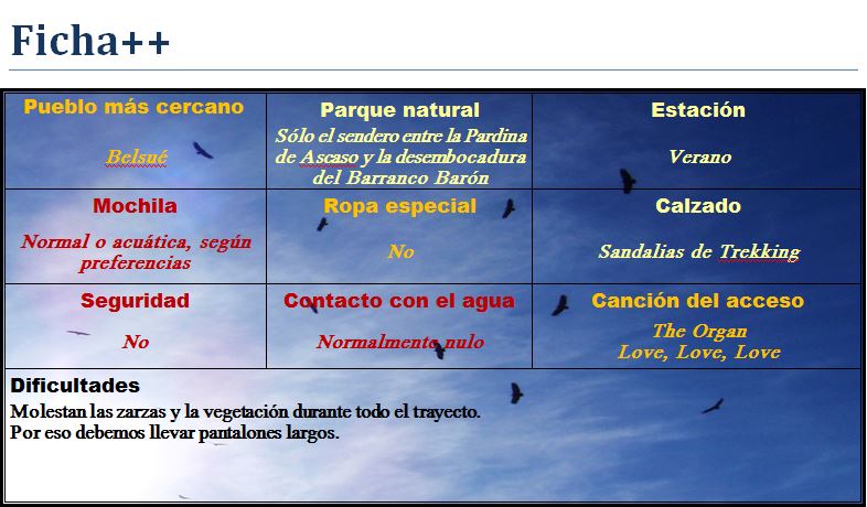Ficha UbietoAl principio de la excursión veremos el pueblo de Santa María de Belsué y la Pardina de Ascaso. Las dos aldeas se encuentran en la orilla del Río Flumen, abandonadas pero bien conocidas por el fácil acceso y la cercanía de unas maravillosas pozas. Las otras dos, mencionadas en el párrafo anterior, son mucho menos conocidas y de acceso largo.