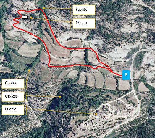 Siguiendo por la senda cruzamos el Barranco del Puyasieto y más adelante llegamos a una fuente donde el perro se podrá refrescar en un charco. A partir de dicha fuente el camino es más ancha, debido a una pista que substituía a la senda hace tiempo. En algunos tramos se divisa todavía la trocha original de la senda. En la loma que tenemos justo delante vemos la copa de un viejo quejigo que supera en altura todos los demás. En la cercanía de este árbol se pueden observar viejos muros derrumbados que cuentan de un uso destinado al cultivo de estas tierras hace tiempo.