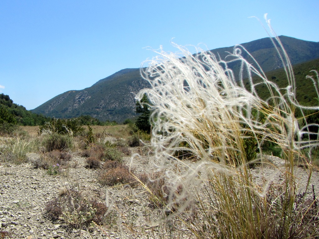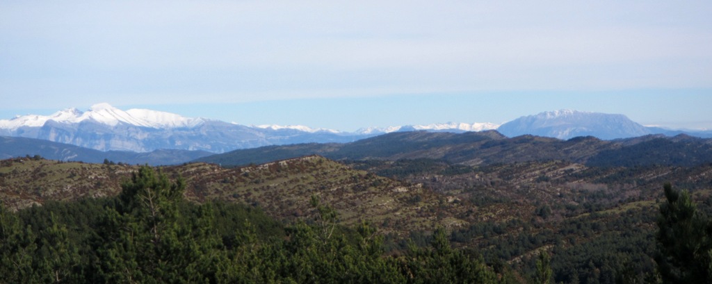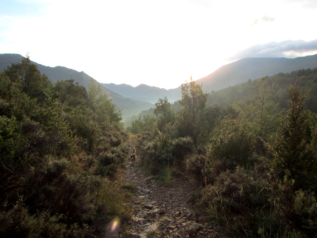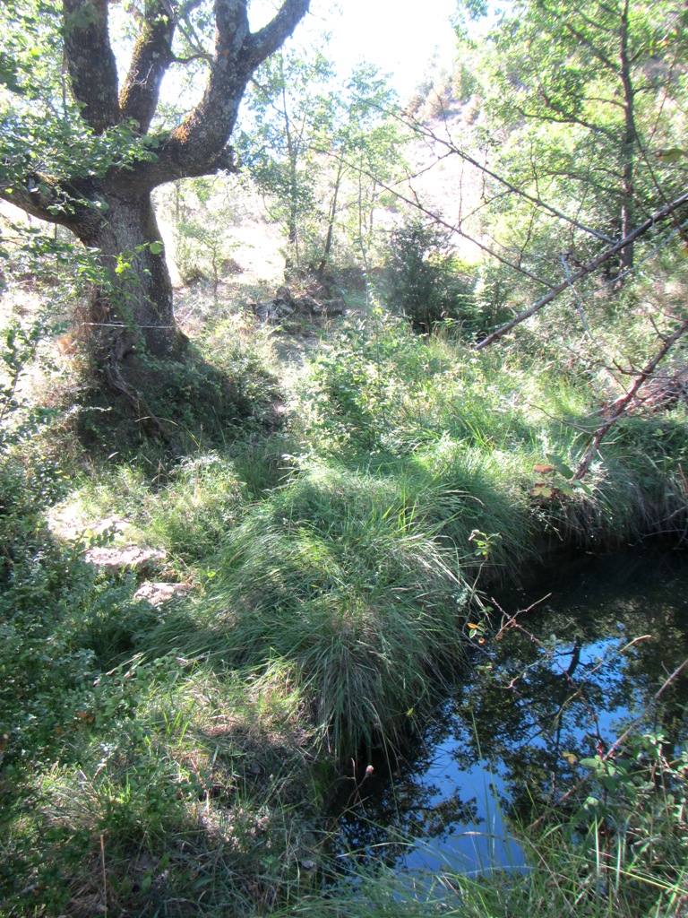 A mano izquierda de la pista mencionada, a 10m de la carretera hay una borda derruida. Desde esta ruina podemos bajar por una canal y atajar de este modo una larga lazada de la pista. La senda que discurre por la canal está poco definida, pero por las características del terreno resulta obvia. Hay que superar dos resaltes y al final molesta un poco la vegetación, pero nos evitamos mucho trozo de la pista calurosa.