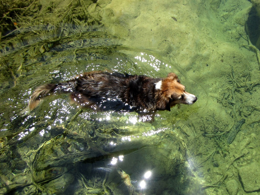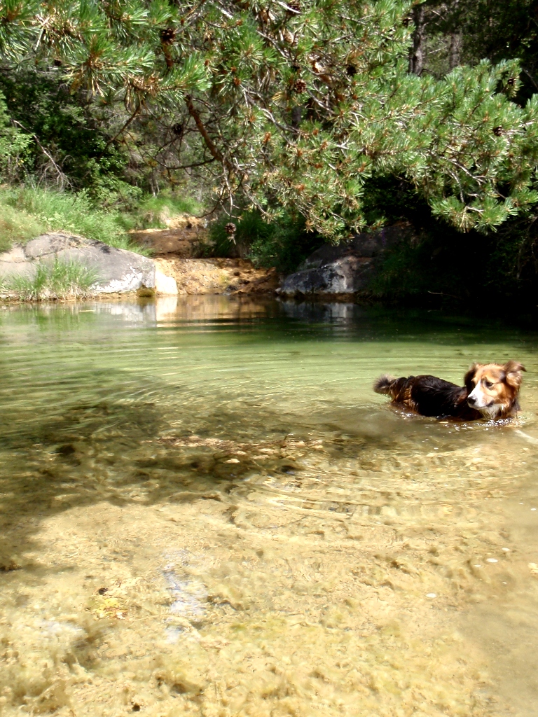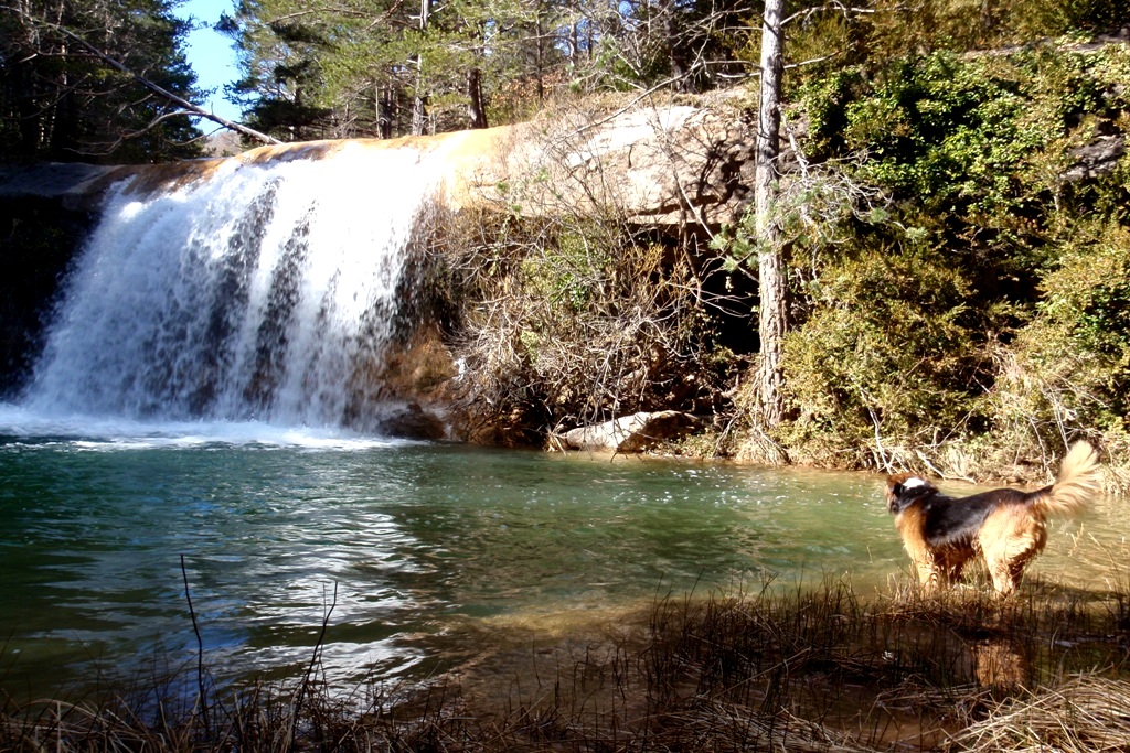 Menos mal que uno de los austriacos es guía de montaña, llevaba (como siempre) unas cuerdas en el coche y pudo instalar un rápel. Mientras él estaba instalando, hubo un momento, en cual ya no escuchamos más los chillidos de Robert. Yo, pensando lo peor, empecé a perder la calma. Pero la novia bajó heroicamente al pozo para salvar al pobre perro. Lo encontró agarrándose en una cornisa dentro del pozo temblando de miedo. Después de este susto, nos fuimos a las pozas del Flumen para relajarnos.
