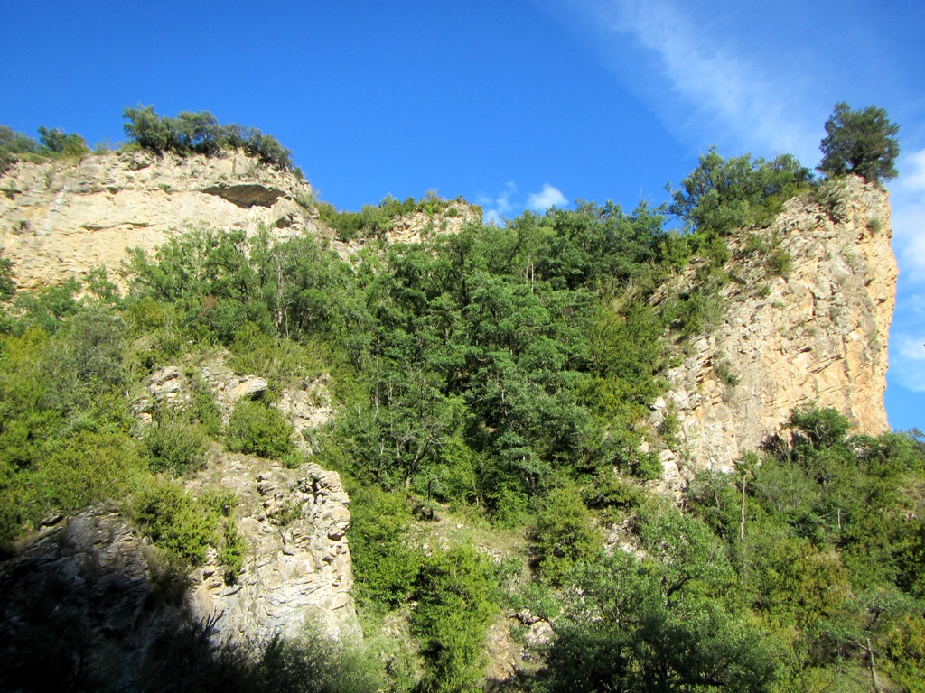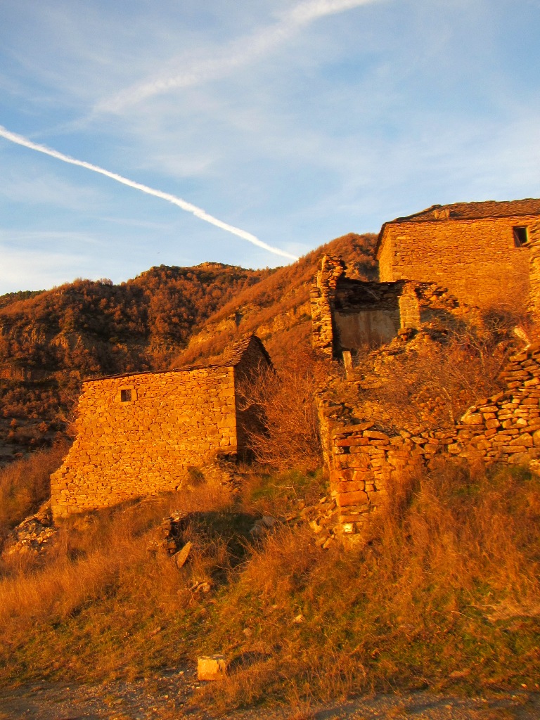 Andamos por el GR que se dirige hacia el oeste y cruza en seguida el río. (En este punto podríamos seguir ya por el lecho. Mas adelante encontraremos otras posibilidades para bajar al río.) El sendero nos lleva en lo alto a unos edificios en ruinas.