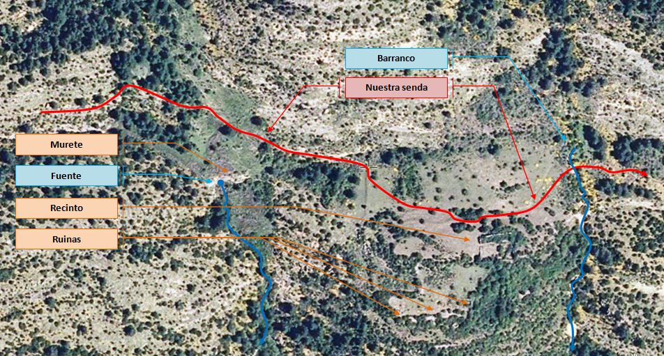 Primero encontraremos las ruinas de la Pardina de Usieto y más adelante los montones de piedras de las edificaciones derruidas, muros caídos, terrazas y campos que recuerdan de la existencia caducada de un gran corral o parecido en aquel lugar privilegiado, cuyo nombre no conozco.