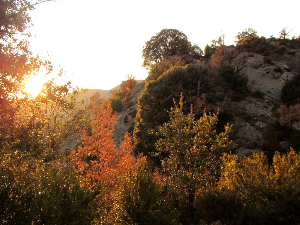 Donde hemos llegado en el acceso al lecho del río tomamos la prolongación de la senda que empieza a ascender por la loma en dirección este. Nos llevará a un collado donde desemboca de nuevo en la carretera. Antes de topar con esta giramos a la derecha y bajamos por una visible senda hasta el lecho del río.