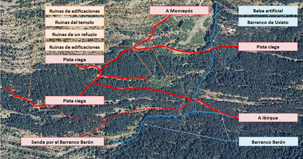 Por la orilla izquierda del Río Flumen sube una senda hacia el Monrepós (Más información en la entrada «El tramo olvidado del Flumen«). Por la orilla izquierda del Barranco Barón sube una a la Pardina de Ubsieto (Más información en la entrada «Vuelta por el Tozal de Lusera«) y en la orilla izquierda debajo de la desembocadura encontraremos otra que conduce a Santa María de Belsué. Esta última nos podría servirá de retorno.