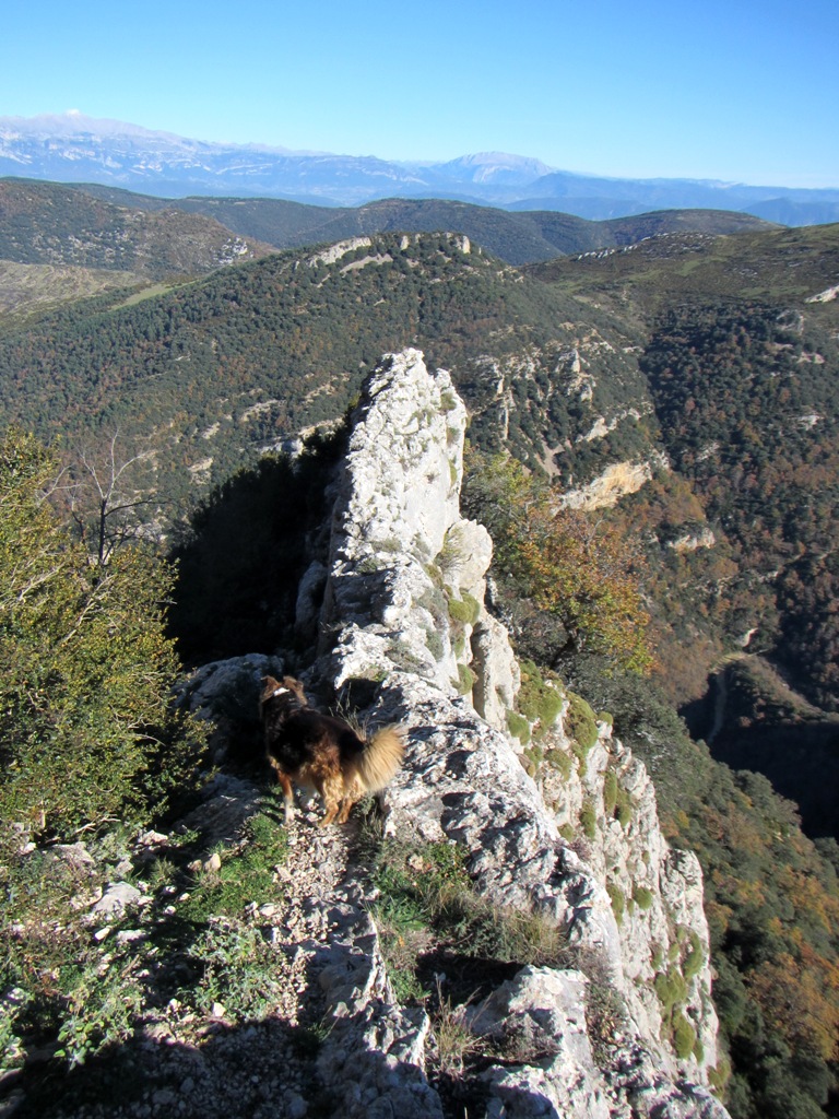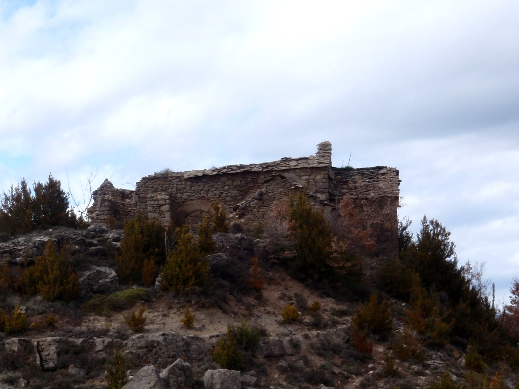 Se usa esta senda como ruta BTT y resulta muy probable que nos cruzamos con ciclistas – en este tramo en pleno descenso. Debemos controlar el perro para prevenir posibles accidentes. Ya cerca de la cresta veremos a nuestra derecha un pequeño recinto en ruinas que podemos visitar.