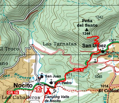 Seguimos por la pista de San Cosme (carteles). Marchando por ella nos entretenemos por las buenas vistas sobre la zona. Justo cuando la pista empieza a bajar y torcerse hacia la izquierda hay un desvío. Tomamos la pista a mano derecha que sigue discurriendo por la loma y no pierde altura. (En dicha bifurcación arranca también una senda que lleva a la Ermita de Fabana (y Nocito). Esta senda está señalizada. Nosotros ignoramos estos carteles y avanzamos por dicha pista.) La seguimos hasta llegar al cauce.