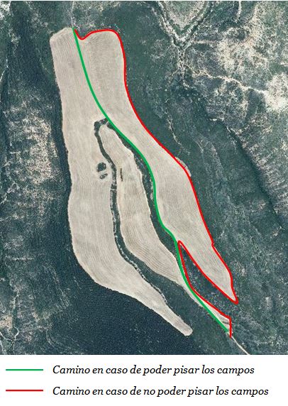 En la pista iniciamos una larga y soleada bajada por una suave loma. Cogemos la pista a mano izquierda en una primera bifurcación. Así llegamos a la Ártica Salas donde tenemos que cruzar de nuevo un campo cultivado. En el otro extremo del campo baja una vieja pista a una pasarela sobre el Formiga. En la otra orilla del Barranco topamos con el camino de acceso del cañón que usamos para volver al coche. Más información sobre esta zona se encuentra en la entrada «Visita al Cañón del Formiga«.