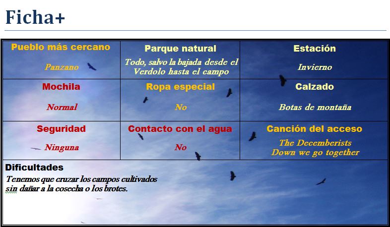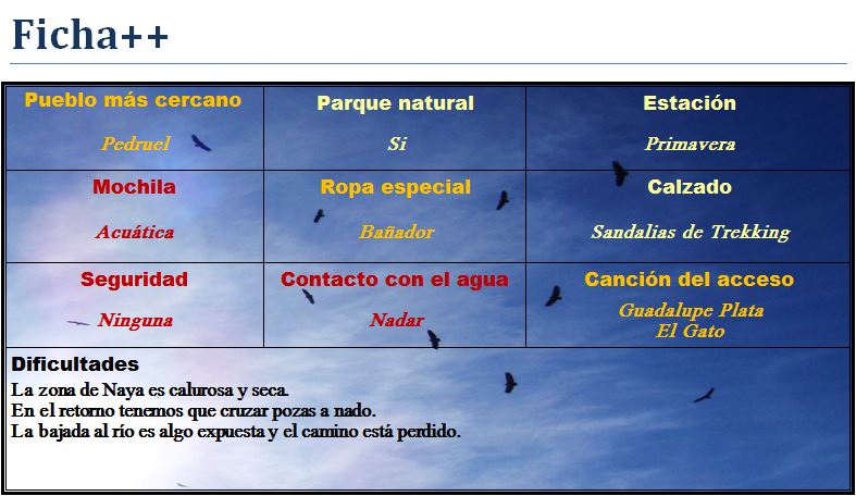 Rodeando los estrechos pasamos por zonas muy distintas durante la jornada. Remontando el Río Alcanadre estamos dentro de uno de los principales cañones tocando casi siempre el agua, incluso a nado. Después pasando por el Huevo de Morrano tenemos que aguantar el calor que es tan típico en la Sierra fuera de los cañones. Otra vez en el río, disfrutaremos de una de las pozas más bonitas de la sierra: La Fuente Tamara y el Puntillo. Allí podemos pasar la tarde, para plantear el retorno al coche en una hora más fresquita, cuando el calor ya no molesta.