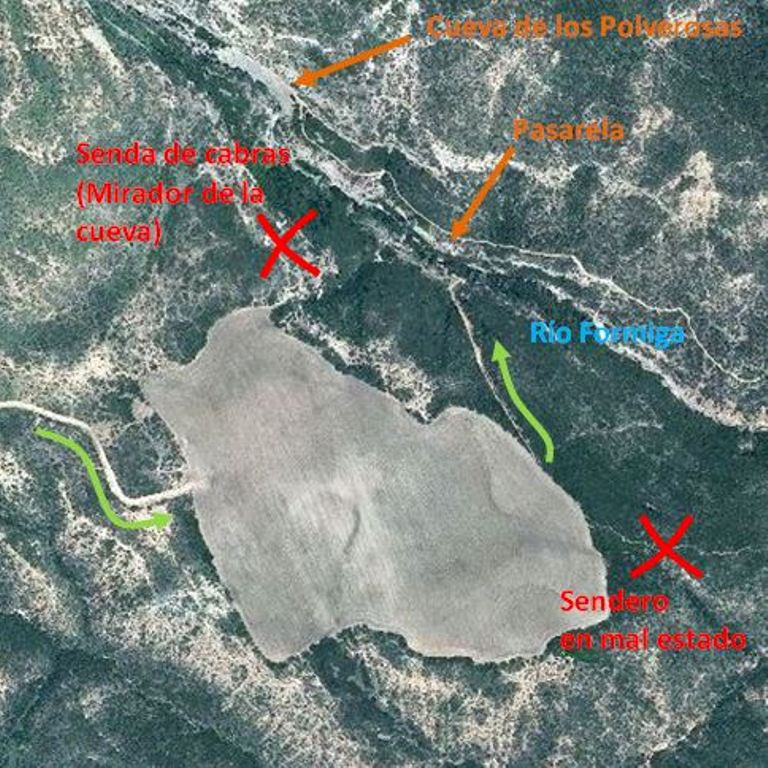 Cuando llegamos al punto donde cae el agua unos 4m adentro de una grieta, controlamos al perro, pues hay rebufos, troncos y cuevas ocultas en la grieta y la corriente en la cabecera de la cascada puede ser fuerte. En la  orilla izquierda, hay una senda con un paso de I, que nos lleva río abajo por fuera del cauce y de los bloques que lo oprimen. Una vez debajo del caos no hay mas peligro y el cauce está abierto. Podemos ir cómodamente por la orilla hasta que el río cae a dentro de otra grieta. Esta vez la caída es más modesta, incluso podemos, si queremos, entrar en la badina estrecha que forma la grieta y seguir nadando. En la orilla izquierda hay una pequeña cueva y una fuente importante, donde el agua sale en varios chorros de la pared. Nadando o andando llegamos a la maravillosa poza final. Allí los acantilados desafían a los más valientes a saltar al agua.