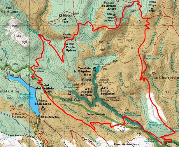 El Tozal de Verdolo está partido en dos piezas por una impresionante grieta de una anchura media de un metro. Con un buen brinco la podemos cruzar, nosotros como el perro. Su «inicio» podemos haber visto escondido detrás la vegetación en el mirador que hemos pasado antes de la bifurcación de las sendas. En la cara oeste se pierde en el acantilado que cae al embalse. Tenemos que controlar al perro, especialmente si es joven y/o impetuoso.
