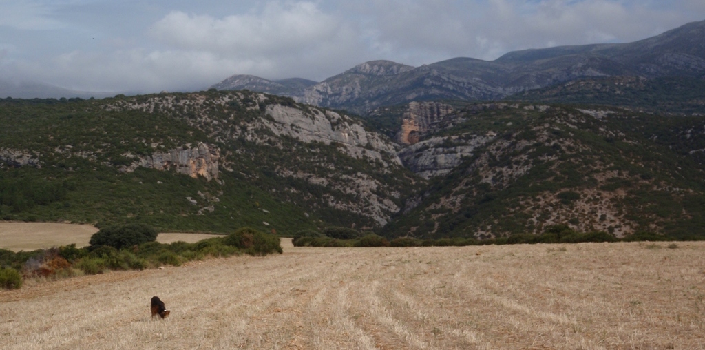 La pista sigue recto hasta un cruce. Tomamos la pista que sube a mano izquierda. En seguida empieza a bajar por un corta fuegos y llega a una larga loma: la Loma Güega. En la bajada podemos contemplar el Huevo de Morrano, que se presenta todavía lejos en el otro lado del Río Alcanadre. La pista finalmente se convierte en un camino y llega por unos campos de matorral al rocoso y escarpado final de la loma. Desde aquí tenemos buenas vistas sobre el cañón que está a nuestros pies. La senda baja por la derecha para después girar hacia la izquierda y pasar por debajo del espolón rocoso. Siempre tirando hacia el sur, baja hacia el río. Ahora vemos la Cueva de los Tisidores río abajo que se traga la mitad de una poza.