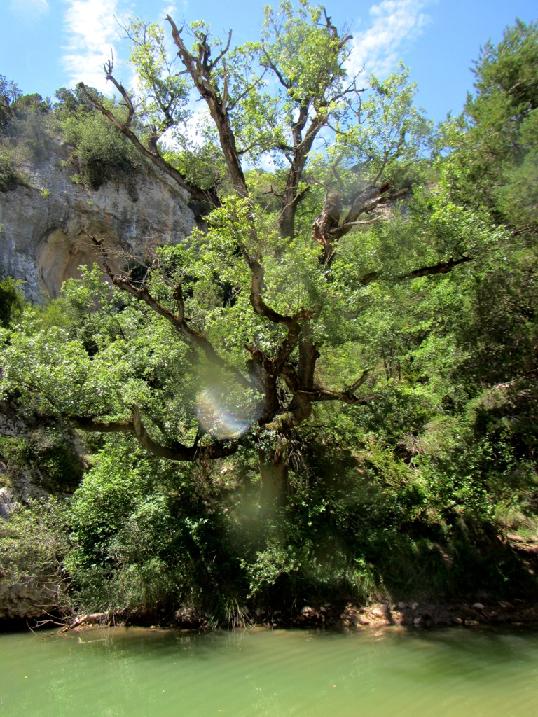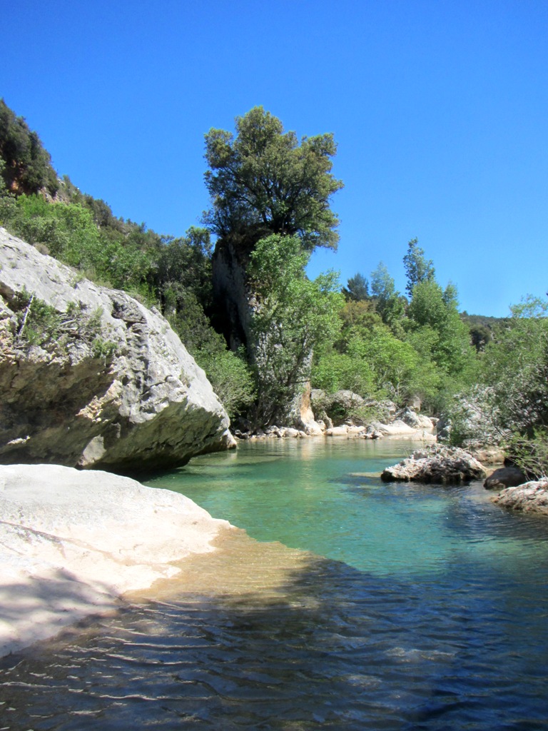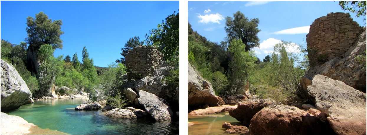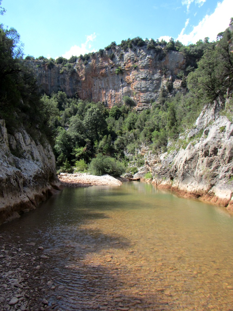 En este tramo predominan las pozas. El lecho del río esta salpicado por bloques grandes en cuyos alrededores remansa el agua – un tramo del Alcanadre que es muy bello y poco conocido, ya que no hay ningún acceso fácil. Pronto llegamos al Puente de la Famiñosa y la Poza del Molino.
