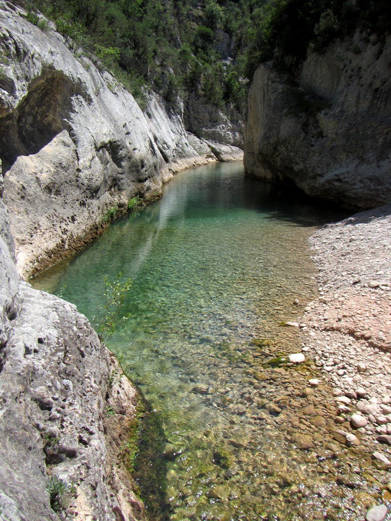 Después de una larga recta una bonita poza inicia un caos. La mejor manera de resolverlo es evitar gran parte del curso del agua trepando por las rocas de la orilla derecha (nuestra izquierda). De este modo podemos estudiar como son las corrientes entre las rocas que obstruyen el cauce y planificar una ruta por el agua para cuando volvamos. En general este caos no es dificultoso o peligroso, pero a veces unos troncos se clavan entre las rocas durante las riadas y forman sifones o otros tipos de obstáculos. ¡Cuidado con eso!