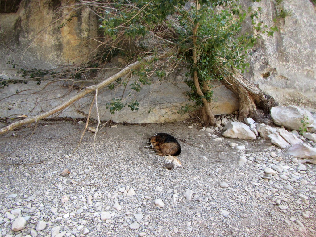 Todo el trayecto es por terreno seco y árido, ya que apenas hay árboles que podría dar sombra. Cuando llegamos a dicha fuente y el río nos podemos refrescar de nuevo. El perro tendrá incluso necesitad de beber agua y mojarse.