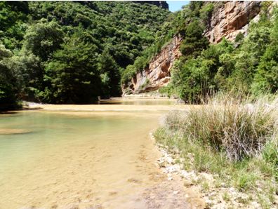 La senda se acerca al río poco a poco y pasa ahora por viejos campos y terreno más luminoso. Si nos fijamos en el tipo de roca, nos damos cuenta que llegamos ahora – después de pasar por zonas de caliza y anteriormente conglomerado – a una zona de arenisco. Finalmente llegamos al agua. La Senda de los Carboneros sigue su trayecto hasta Nocito por la otra vertiente, pero como enlaza pronto con una pista pierde mucho de su encanto. Nosotros nos hemos alejado ya suficiente de nuestra base en Vadiello y tenemos que pensar en volver (3h 30, aún no hemos llegado a la mitad del recorrido).