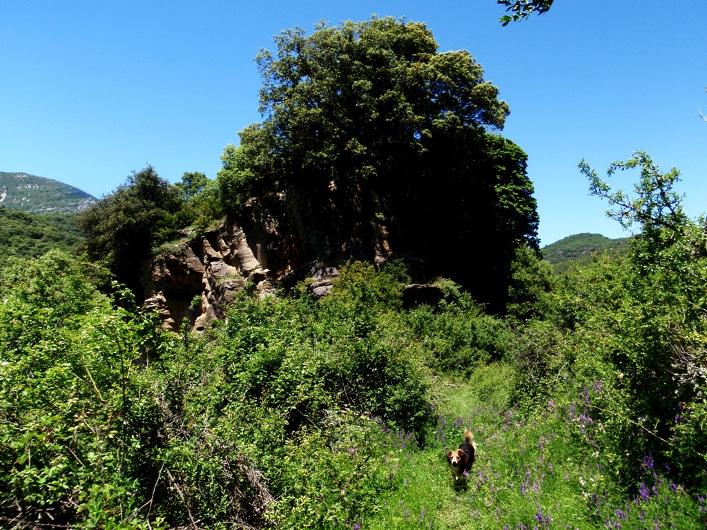 Para acceder a la ventana tenemos que acercarnos antes de llegar al corral de Vallés a la pared abovedada que está a la vista ya desde hace un buen rato. No hay ningún camino, pero el terreno no es demasiado difícil de recorrer. Al otro extremo de la pared tenemos que superar un paso de II, donde el perro, según su habilidad, podría tener problemas. Como la ventana, con estas buenas vistas sobre toda la zona, se encuentra sólo unos 20m más allá, nuestro perro nos puede esperar antes del paso delicado. En total la visita costará 40min.