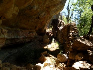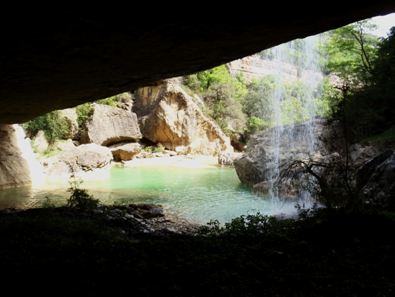Si queremos bajar a la poza y los campos, tenemos que volver por la senda y buscar un camino obvio de acceso al circo. Esta bajada está invadida por la vegetación, pero todavía se puede bajar sin demasiadas molestias. Abajo encontramos, aparte de los campos perdidos, la bonita poza y la cascada, unas curiosas cuevas dentro de un recinto que era un refugio para el ganado y los pastores desde hace tiempo. Cerca de la poza hay un conjunto de piedras que forma cuatro sillas y una mesa. Como el circo es muy idílico y solitario, podemos aprovechar este sitio para descansar cómodamente.