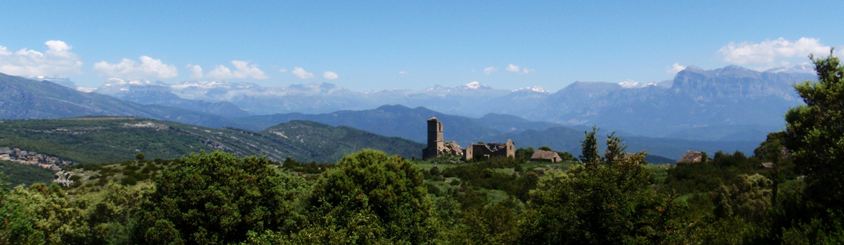 Al fondo (izquierda a derecha): El Macizo del Perdido, la Sierra de las Tucas, la Punta Fulsa y Suelsa, la Bachimala, el Bocolón, Espadas, la Peña Montanesa y la Cotiella)