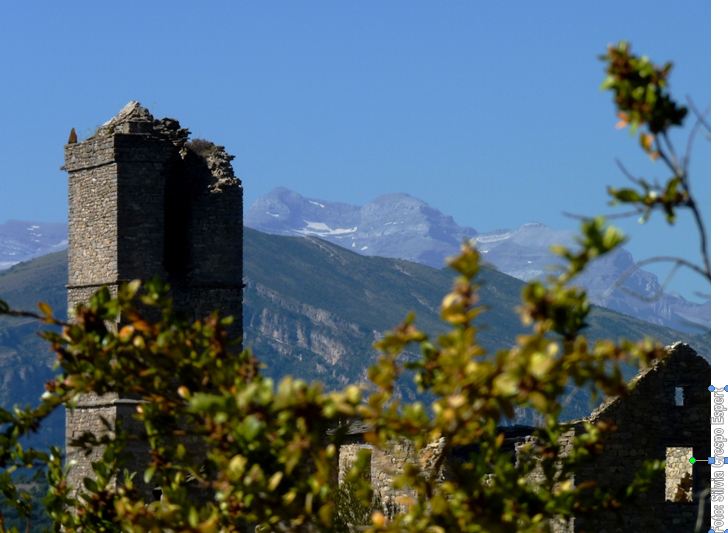 Las ruinas de sus casas están ubicadas en una loma herbosa con buenas vistas hacia el norte. Desde la Collarada hasta la Cotiella, tenemos una buena selección panorámica de casi todo el Pirineo Aragonés delante de nosotros. Encima del pueblo divisamos en la cima un viejo castillo. Por el antiguo camino, ya perdido, podemos subir para contemplar los restos de sus muros. En el pueblo se hallan, entre muchas más curiosidades, 2 pozos. Uno de ellos se esconde curiosamente en una pequeña habitación dentro de la iglesia.