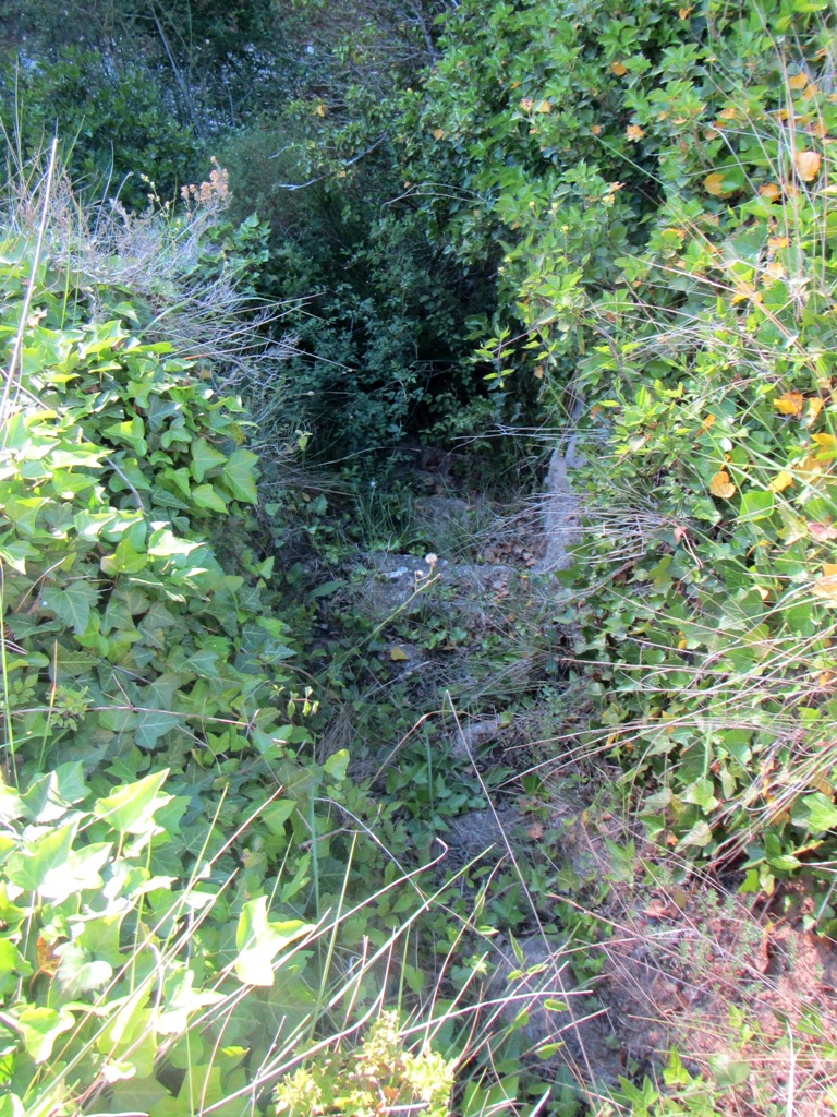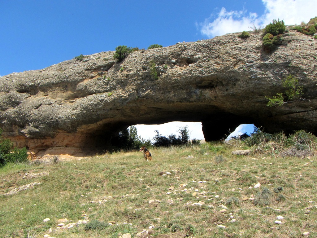 Además se encontraba un molino en la zona donde hemos dejado el coche. Como vestigios quedan los restos de unas presas río abajo del azud actual, y – mucho más impresionante – un sistema confuso de acequias. Se trata de los túneles escavados en la orilla del río. Por estas excavaciones llevaba un canal el agua al molino. Si rastreamos los fragmentos de los túneles encontraremos los más lejanos río arriba del puente colgante (¡!). En alguna zona menos abrupta se puede distinguir todavía la cimentación de la acequia entre la vegetación. Lo que llama la atención es que cerca del azud actual se encuentran dos sistemas de túneles en distintas alturas.