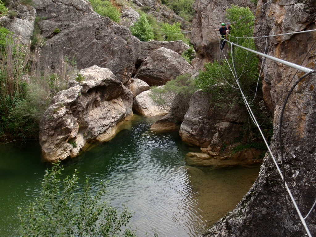 Después de una larga recta una bonita poza inicia un caos. La mejor manera de resolverlo es evitar gran parte del curso del agua trepando por las rocas de la orilla derecha (nuestra izquierda). De este modo podemos estudiar como son las corrientes entre las rocas que obstruyen el cauce y planificar una ruta por el agua para cuando volvamos. En general este caos no es dificultoso o peligroso, pero a veces unos troncos se clavan entre las rocas durante las riadas y forman sifones o otros tipos de obstáculos. ¡Cuidado con eso!