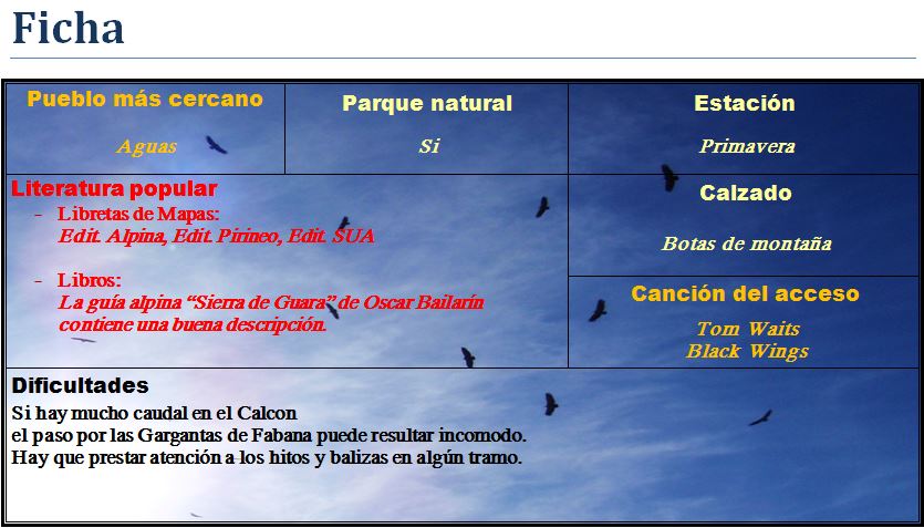 Oscar Ballarín ofrece en su guía «Sierra de Guara – Excursiones, Ascensiones y Travesías» una parte de esta ruta, pero deja de lado el Barranco de Abellada que es para mi el motivo principal para realizar esta excursión.