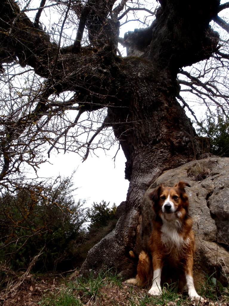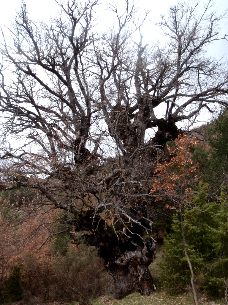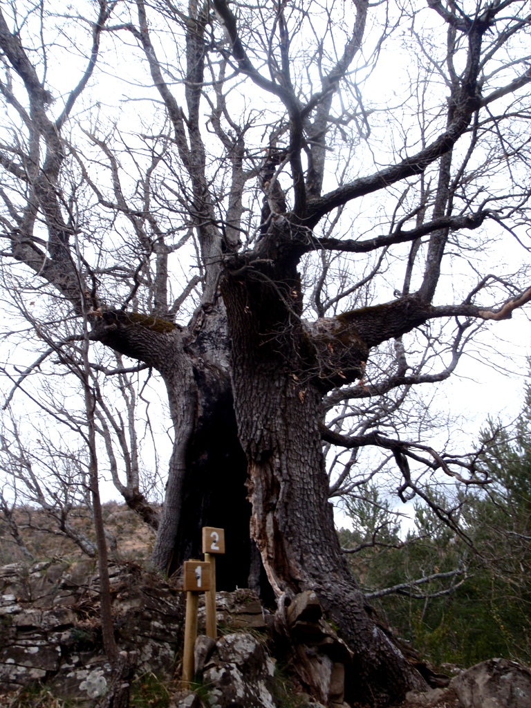 Para llegar a Azpe podemos ir por una pista obvia o, mejor por una senda que se inicia en un visible collado encima de los campos al este de la aldea. Para llegar allí subimos por la ladera, fraccionada por muchos campos, sin ningún camino definido contemplando de nuevo otros ejemplarios de Quercus excepcionales. No hay perdida, ya que el collado está siempre a la vista y la pista se encuentra cerca a nuestra izquierda. A partir del collado el camino está definido y nos llevará en breve a la aldea de Azpe.