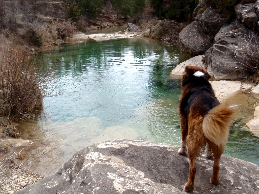 Bajamos por la senda balizada a Used. El camino se aleja del barranco, pero en las cercanías del próximo pueblo encuentra de nuevo la orilla y unas pozas para que el perro se pueda bañar. En esta zona topamos con el GR 1 que nos llevará al pueblo.