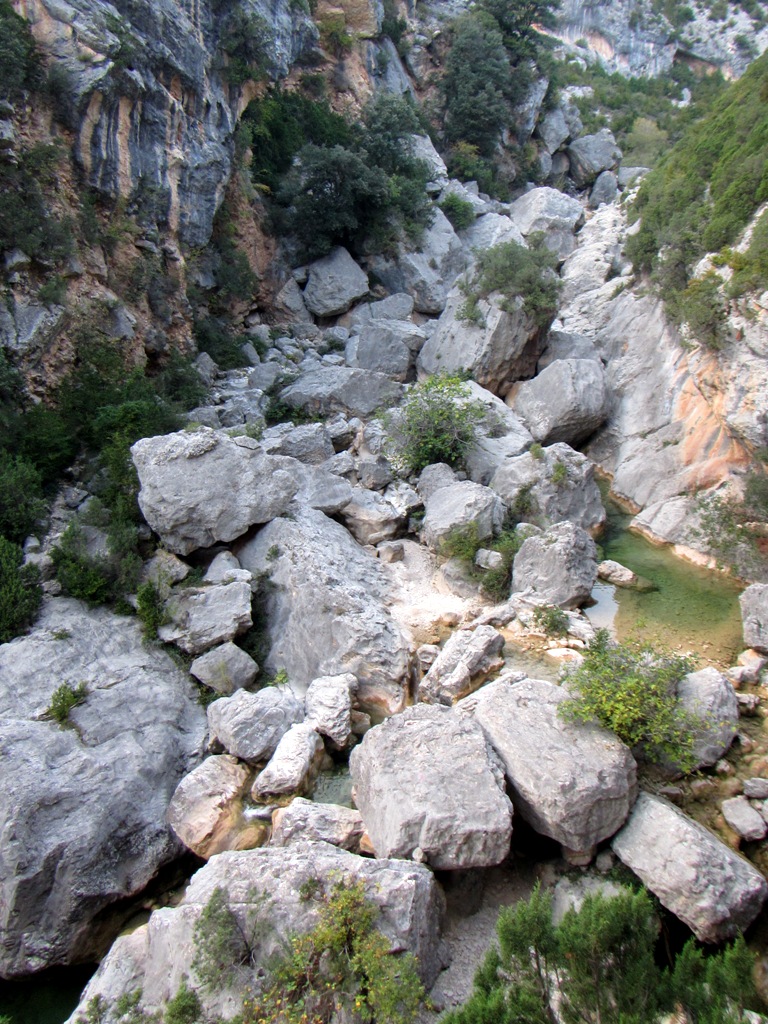 En la orilla derecha del salto encontramos claramente la senda que sigue remontando el barranco, incluso encontraremos una marca del PR en una roca. A poca distancia un desprendimiento ha hecho desaparecer la senda por unos 50m. Podemos seguir trepando por donde iba, bajar al lecho del río y avanzar por el agua o introducirnos en el bosque en el otro lado. En breve veremos en la orilla izquierda una borda en ruinas. A esta altura ya se ha recuperado la trocha del PR en el lado opuesto y la podemos seguir de nuevo cómodamente.