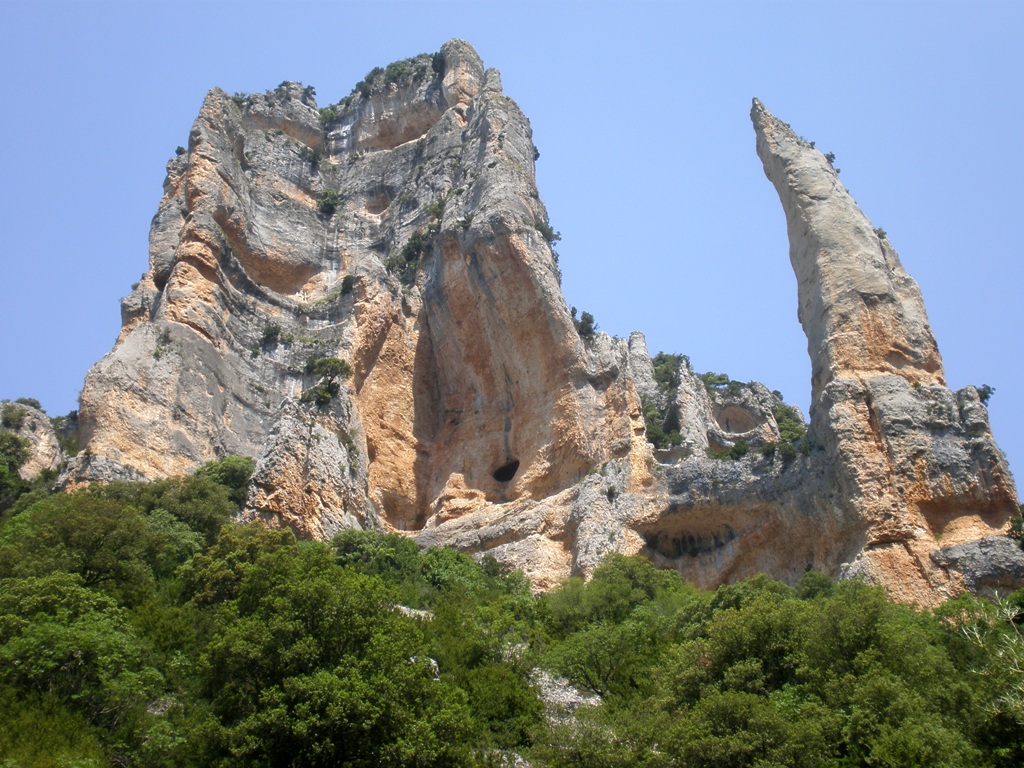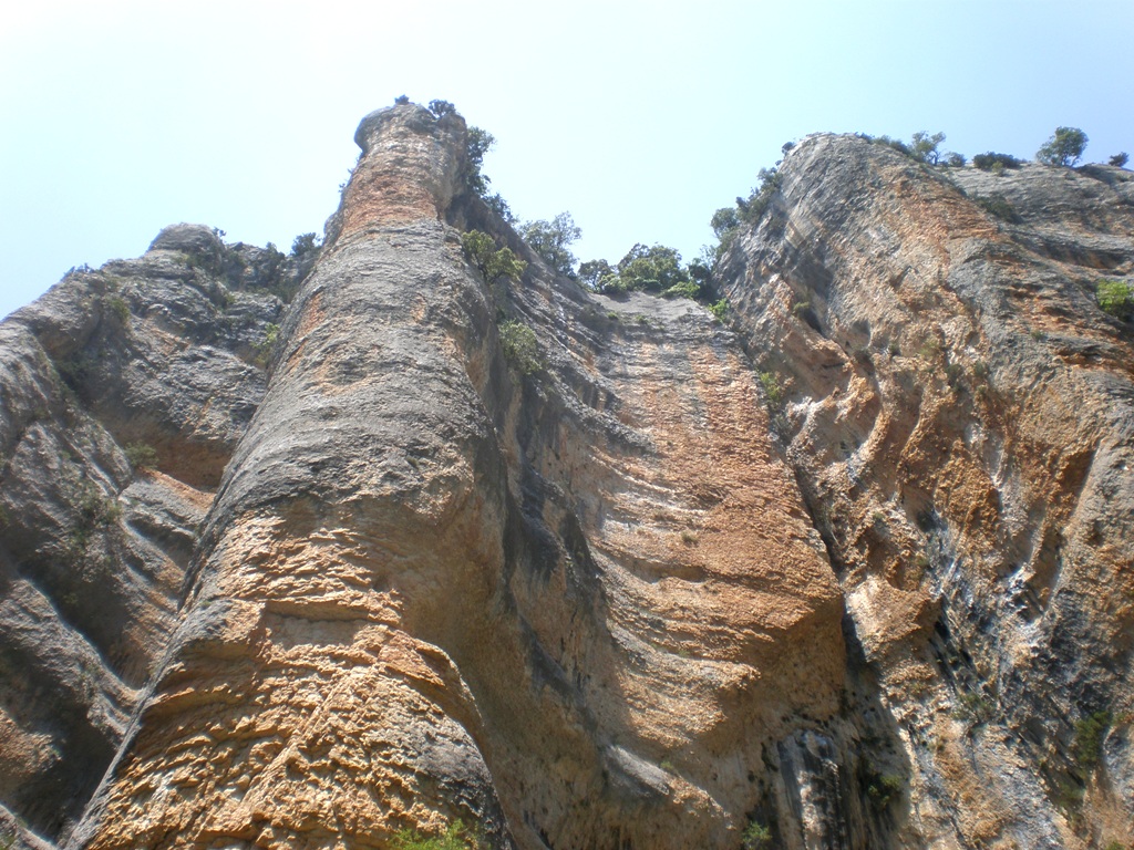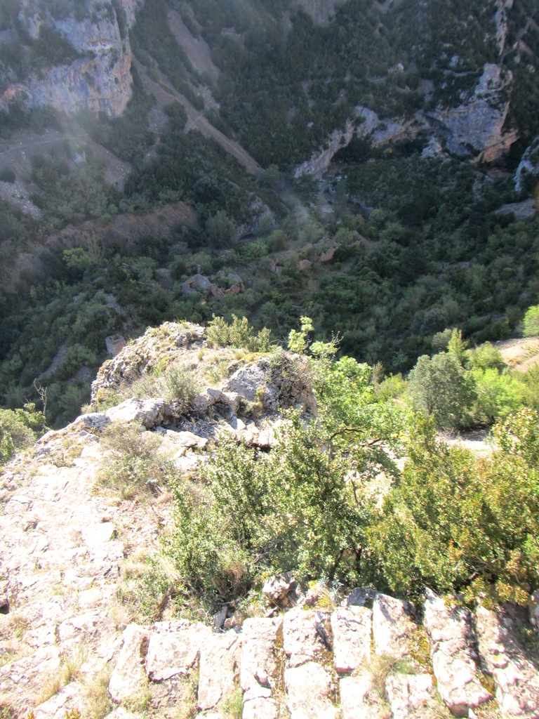 Estamos delante del muro derruido, dejamos el camino a Aineto y empezamos a subir la ladera a mano derecha por donde menos molesta la vegetación, siempre aprovechando los pasos de ganado de una terraza a otra. Si hemos elegido bien el lugar por donde avanzar llegaremos al resalte cimero justo de bajo de un curioso desplome de bloques entre los cuales han echado raíces dos cerezos. Debajo de este último resalte rocoso discurre una senda muy tímida en horizontal. Giramos a la derecha y avanzamos por ella hacia el este sin más dificultades. Ya en el extremo oriental de la peña veremos una antigua escalera de piedras que supera dicho resalte y nos llevará a la cima del Castellar.
