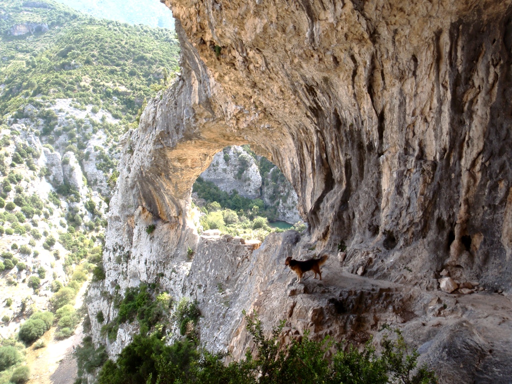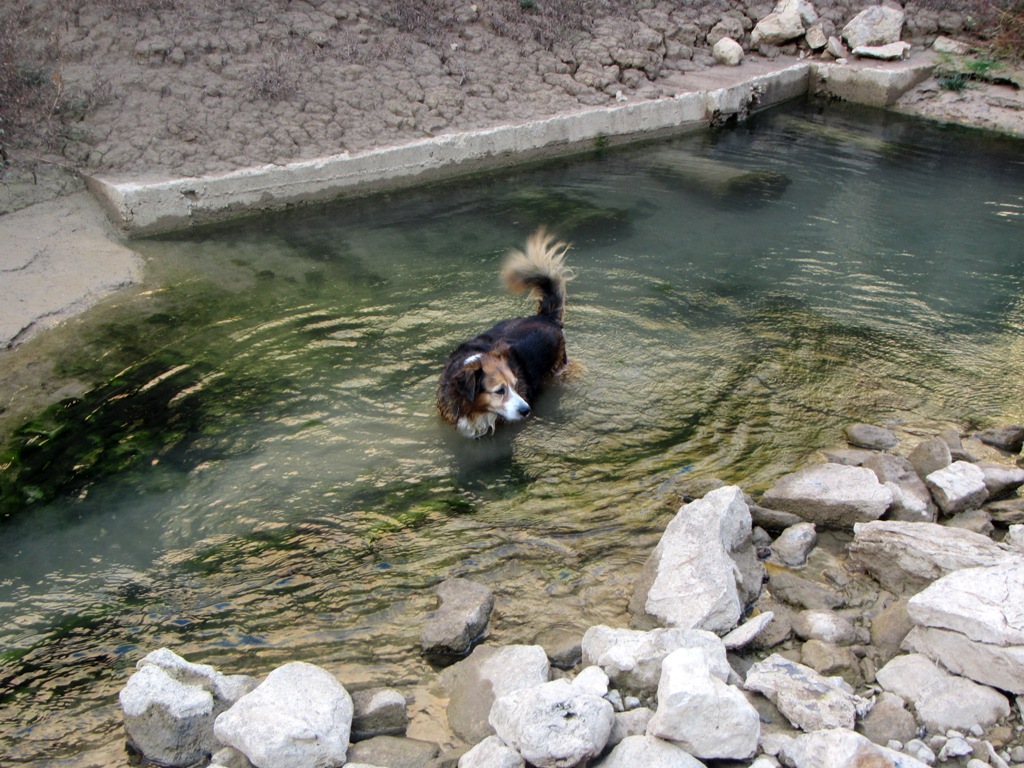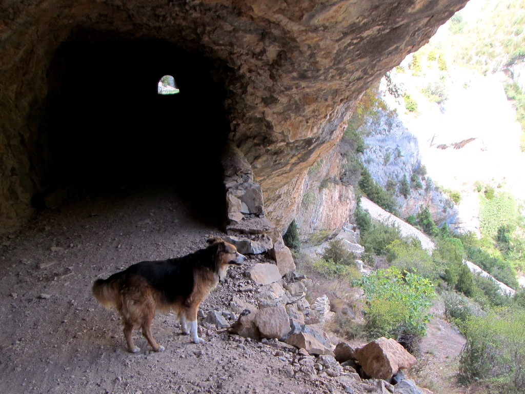 Seguimos por el camino a Aineto en dirección oeste. De este modo empezamos una larga travesía en horizontal por terreno seco. Debemos prestar mucha atención para no perder la trocha, ya que la presencia de los hitos disminuye. Mucho más adelante llegamos a la cabecera seca de un barranco. A mano izquierda hay un muro y unos hitos indican un brusco cambio de dirección: empezamos a descender. En seguida la senda (ya ha dejado ser pista antigua) cruza el cauce seco y se arrima a la orilla derecha. Constantemente acompañado por este pequeño afluente al Barranco de la Arredola bajamos directamente a la senda de acceso justo en el cruce mencionado al principio. De nuevo en terreno conocido el perro puede refrescarse y nosotros deberíamos disfrutar de un último descanso. Sólo resta volver por el curso del agua al coche.