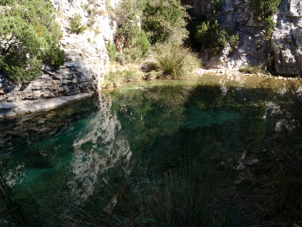 Pronto llegaremos a la confluencia del Barranco del Lenar (nuestra derecha) con el Barranco de la Arradola (izquierda). En este punto ya escuchamos, incluso divisamos el pequeño salto que forma la bonita poza de la Arredola – nuestro primer objetivo.