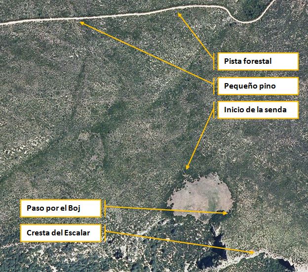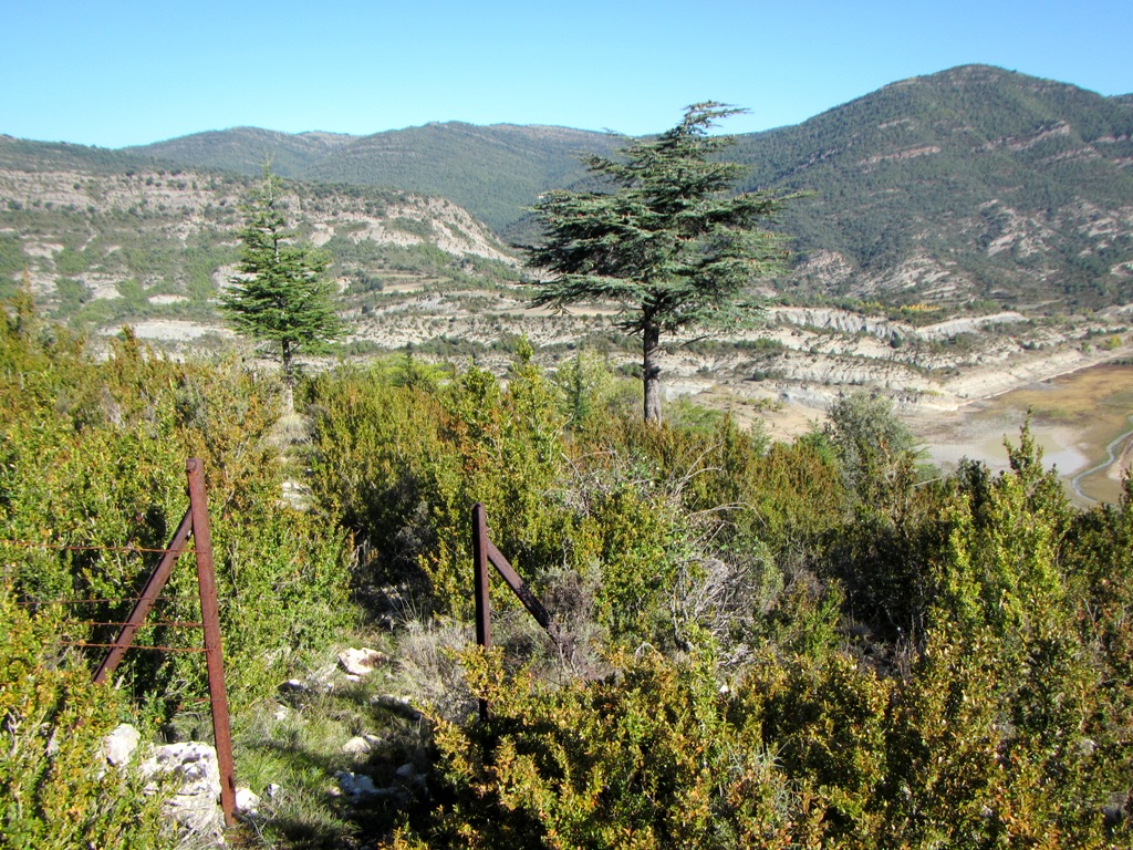 Sea como sea, debemos seguir. Cuando coronamos una primera cima de la loma, desaparece el pinar y con él también el camino. Es allí donde empiezan las molestias y dificultades por la vegetación. El itinerario discurre siempre por la cresta. Nunca debemos alejarnos de ella. Después de salvar varias cima y collados, algunos repletos de maleza, topamos con los campos donde está el Caxico Arialla. Si no nos hemos alejado de la cresta, no hay pérdida.