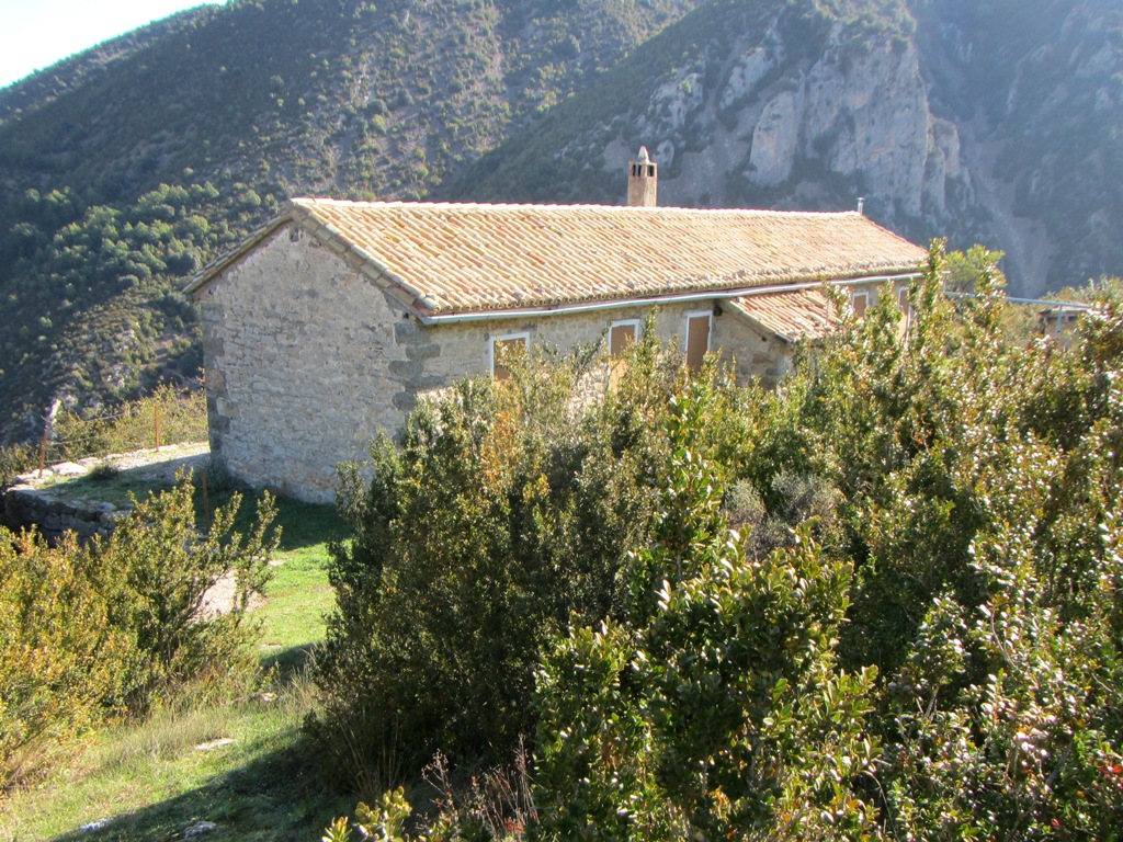 Para bajar de nuevo debemos situarnos en el sur de la ermita donde hay un paso obvio entre las rocas que salva los primeros metros pendientes. Después hay que seguir derecho hacia abajo evitando la vegetación densa – justo como en la subida al Castellar. Cuando llegamos a terreno suave y plano topamos inevitablemente con el camino a Aineto. Este sendero salta a la vista en esta zona, ya que se mantiene uno de los muros laterales de pie.