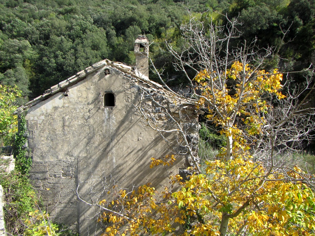 Para acercarnos a la Ermita de Santiago debemos seguir la cresta hacia el oeste. Cuando llegamos al collado entre esta y el Castellar podemos bajar por un paso obvio entre las rocas. Como la ermita ya está a la vista – aunque se camufla entre los arboles – no resulta costoso llegar hacia ella.