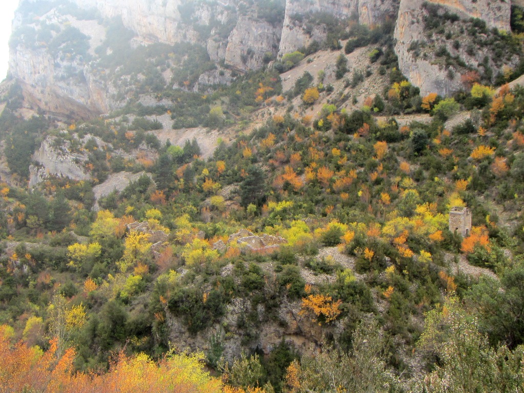 La senda cruza el lecho del río en dos vados. Si el caudal es normal, no tenemos que mojarnos los pies. En breve llegamos a un cruce de caminos que es poco visible. Desde nuestra izquierda bajar una senda desde Secorún (nuestro retorno) y por la derecha su prolongación sube a la pista que lleva a Aineto. Nosotros ignoramos estas sendas (si las hemos visto) y seguimos remontando el barranco. Ahora hay restos de sendas en las dos orillas, incluso podemos avanzar por el mismo lecho del río.