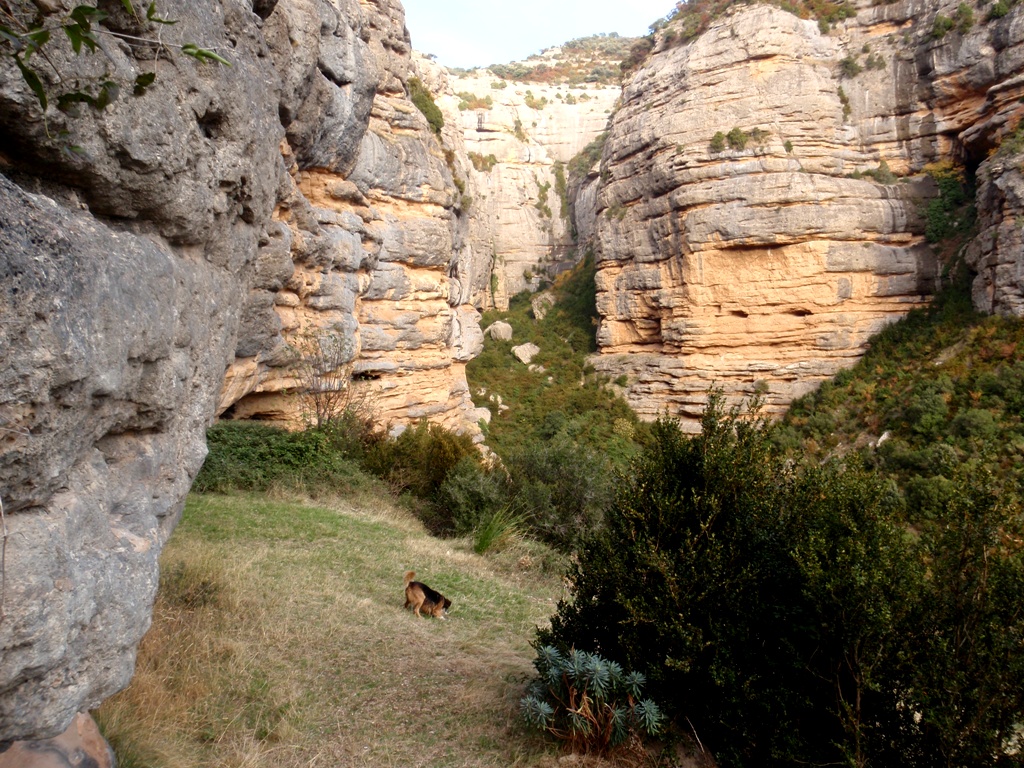 Siguiendo por la senda cruzamos el Barranco del Puyasieto y más adelante llegamos a una fuente donde el perro se podrá refrescar en un charco. A partir de dicha fuente el camino es más ancha, debido a una pista que substituía a la senda hace tiempo. En algunos tramos se divisa todavía la trocha original de la senda. En la loma que tenemos justo delante vemos la copa de un viejo quejigo que supera en altura todos los demás. En la cercanía de este árbol se pueden observar viejos muros derrumbados que cuentan de un uso destinado al cultivo de estas tierras hace tiempo.
